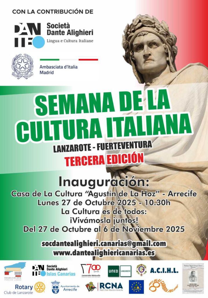 Avv. Alfonso Licata: Salve a lei, Cav. Buccinnà, e un cordiale saluto a tutti i lettori di Arcipelago Canarie. È un onore e un piacere ritornare sulle vostre pagine. Rispondo con un convinto “Sì, siamo pronti!”: il Comitato della Società Dante Alighieri delle Isole Canarie ha ultimato un programma di grande respiro e spessore, frutto di mesi di dedizione. Grazie al fondamentale Patrocinio dell’Ambasciata d’Italia in Madrid e della Sede Centrale della Dante Alighieri, siamo pronti a inaugurare, il prossimo 27 ottobre ad Arrecife, Lanzarote, una manifestazione che si preannuncia come un autentico ponte culturale tra Italia e Canarie.
